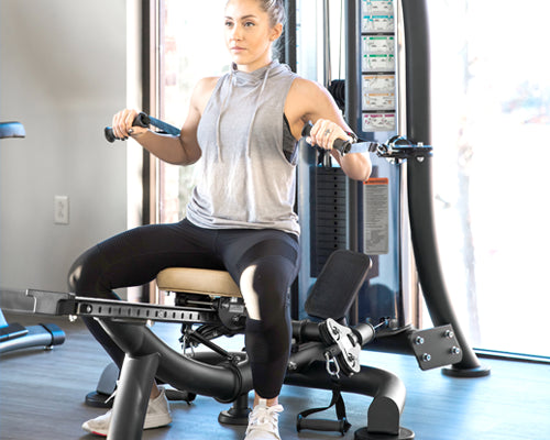 • Pivoting back pad and dual rubber-coated foot placements offer support for upper body push and pull exercises