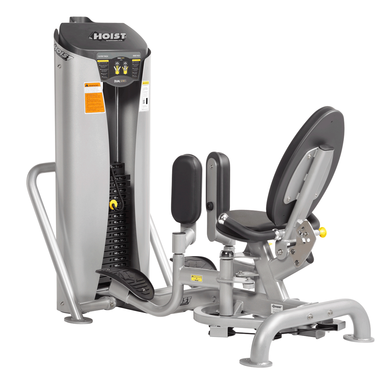 The HOIST® Inner Thigh/Outer Thigh pads swivel for each exercise position, rotating easily and ensuring an excellent workout for both inner and outer thighs. An adjustable-angle back pad accommodates users of all body sizes and ranges of flexibility. Exercise arms can comfortably be adjusted from the seated position, and the unit’s walk through design provides for easy mount/dismount by the user.