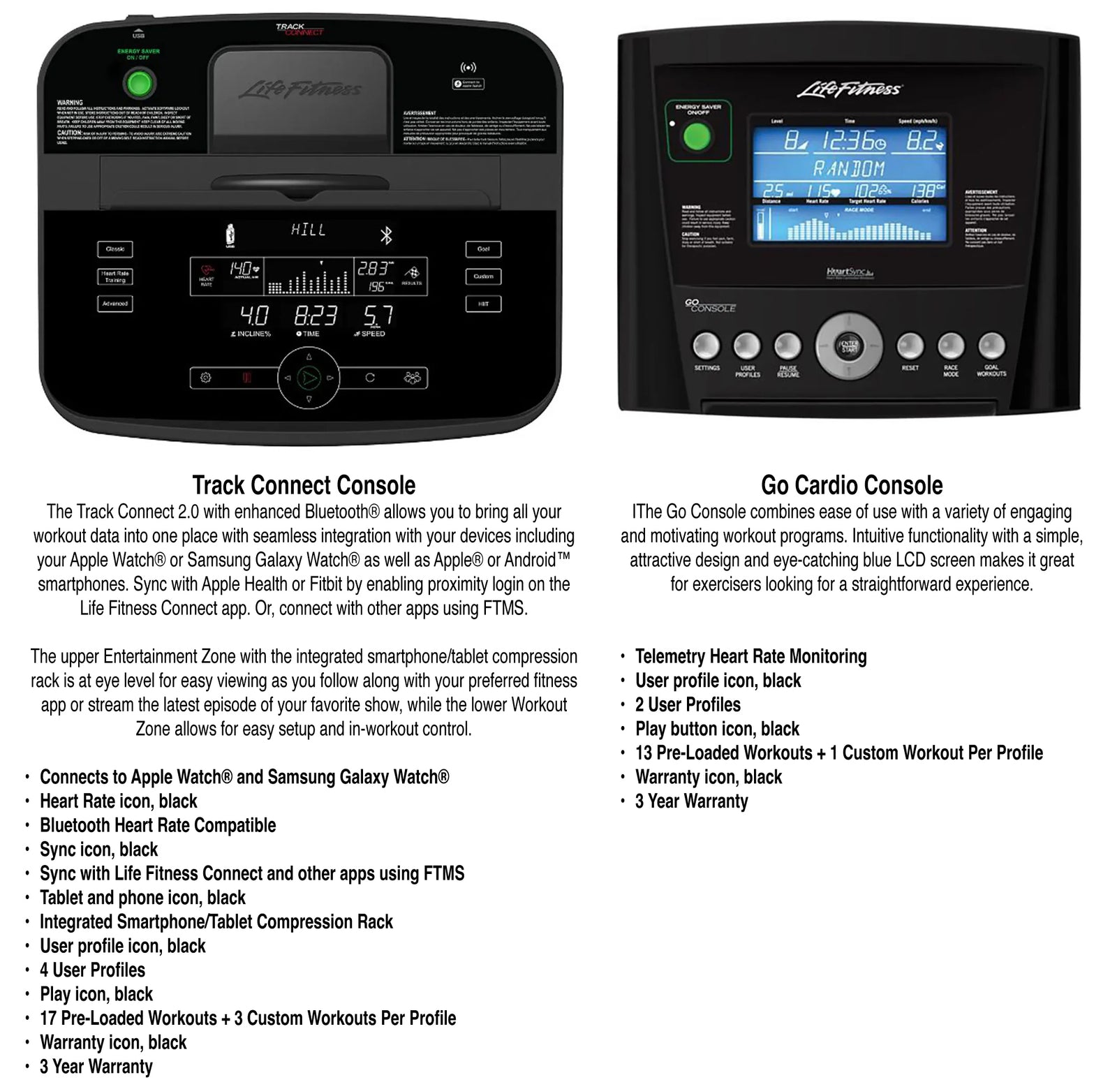 - Track 2.0 Console:ย The Track Connect 2.0 with enhanced Bluetoothยฎ allows you to bring all your workout data into one place with seamless integration with your favorite devices including your Apple Watchยฎ or Samsung Galaxy Watchยฎ as well as Appleยฎ or Androidโข smartphones.