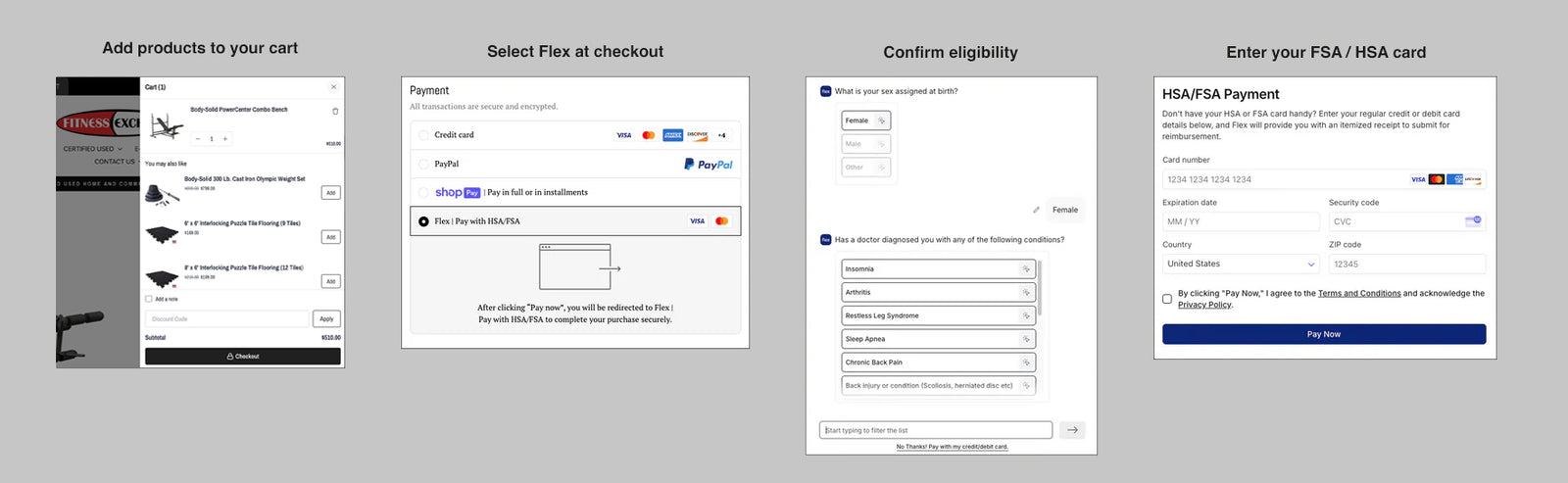 Flex has partnered with Fitness Exchange to enable consumers to use their HSA/FSA funds. You can think of Flex as an alternative to payment method, similar to Affirm, Klarna etc.