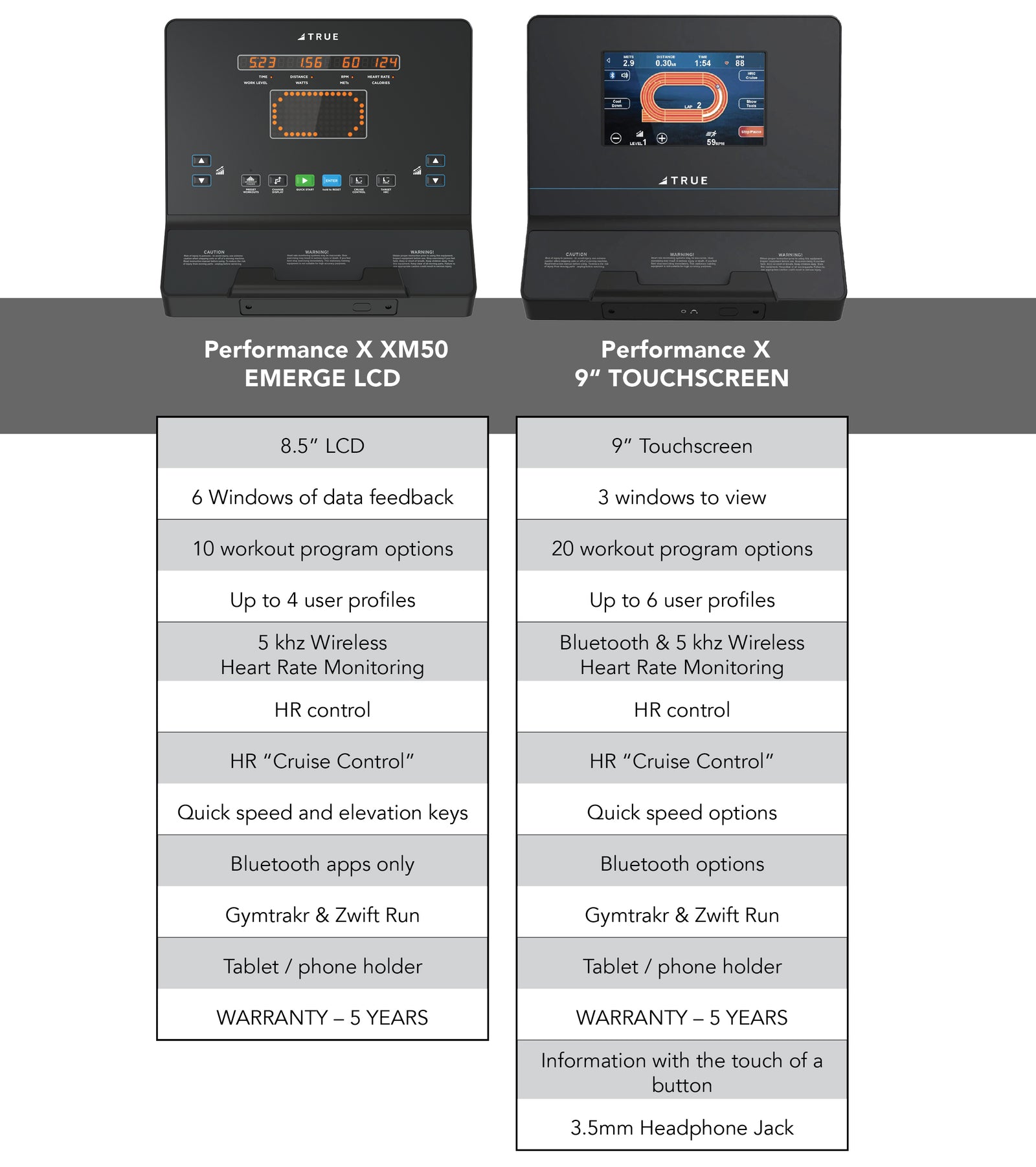 Opt for the 9โ Touchscreen console to utilize Bluetooth connectivity and track your progress. With six user profiles and up to 36 customizable workouts, it offers tailored fitness experiences. The Performance Series also includes TRUEโs HRC Cruise Control to maintain your target heart rate, AutoStrideโข technology for smooth, natural movement, and the Cardio 360ยฎย program for full-body workouts.ย
